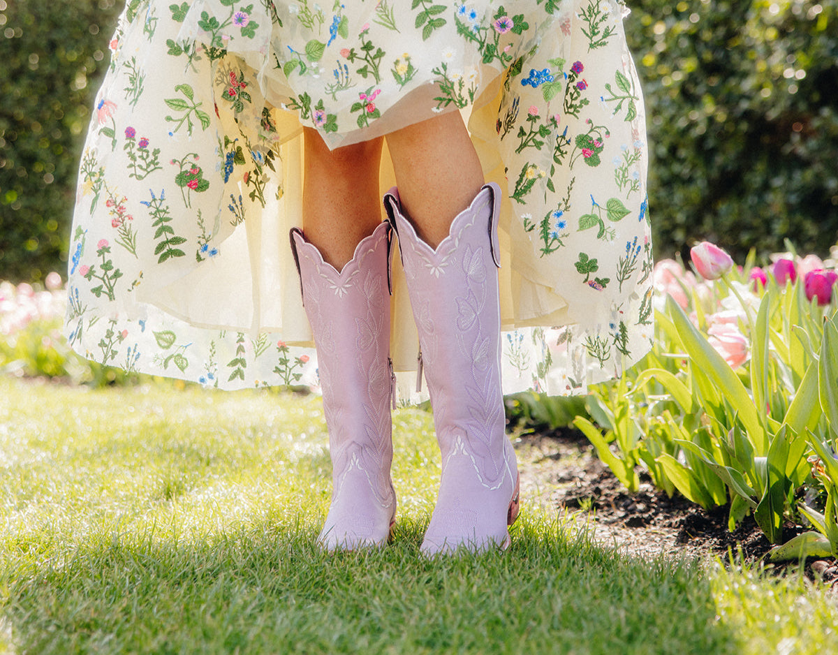 The boot features lovely lavender leather, scalloping, delicate butterfly stitching, and a whimsical, floral-inspired edging, and the Lane signature blue bottom.