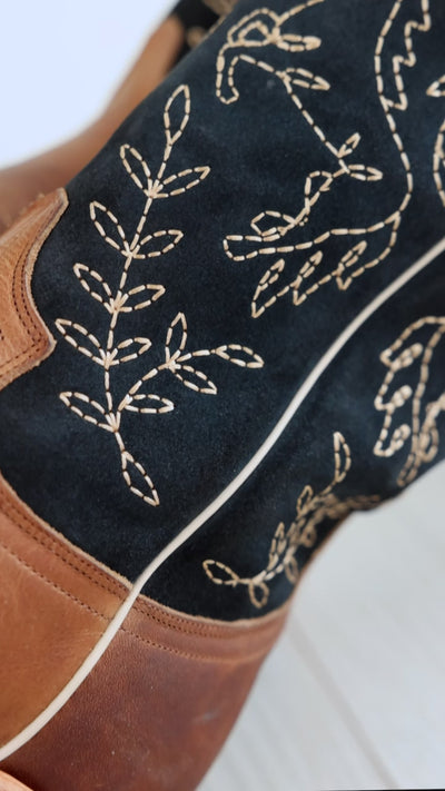 Crafted from rich navy suede, this boot features delicate seed-stitch inspired embroidery that intertwines graceful floral motifs with the spirited silhouette of a mare.