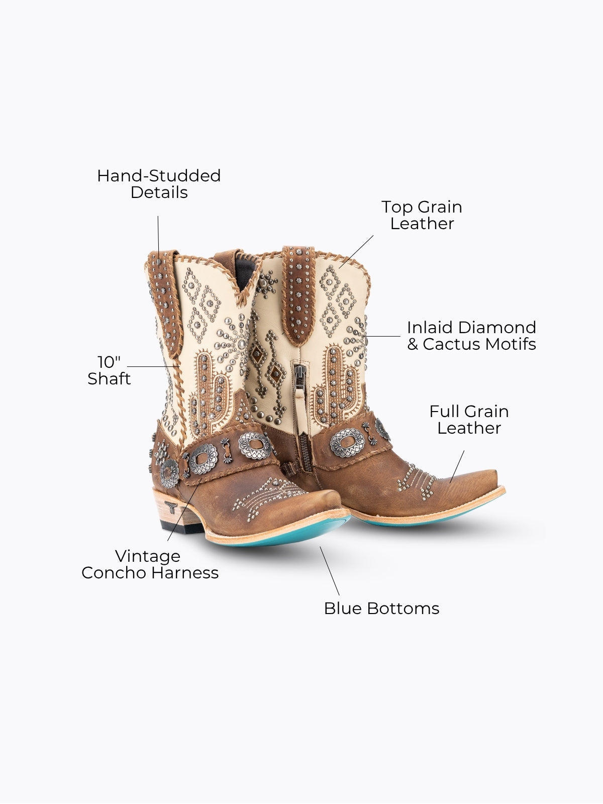 Her front and back quarters are complementary but never identical — intentionally so. The back features iconic studded Western arrows drawn from nostalgic western history, while the front tells its own story through inlaid diamond and cactus motifs, starburst stud clusters, and hundreds of hand-placed studs that catch light the way the desert catches sunset. She doesn't ask for your attention. She demands it.